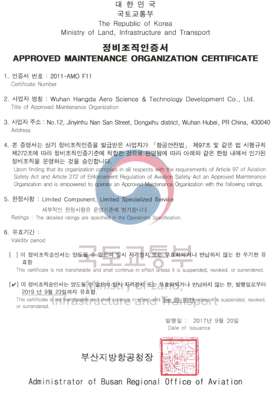 2019年11月  徑河廠區獲得CAAC、FAA維修許可。